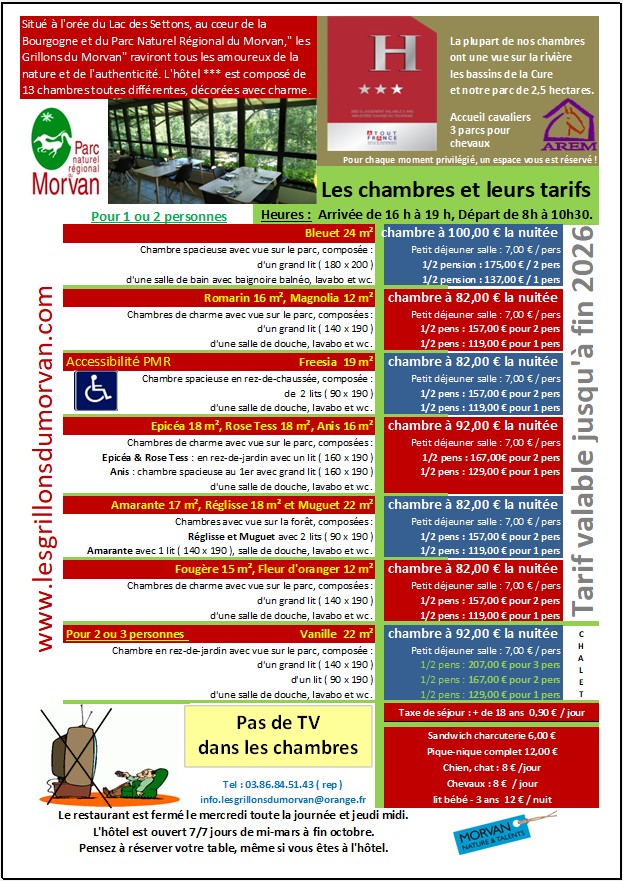 Tarif général de l'hôtel détaillé sur chaque chambre dans la rubrique hôtel.